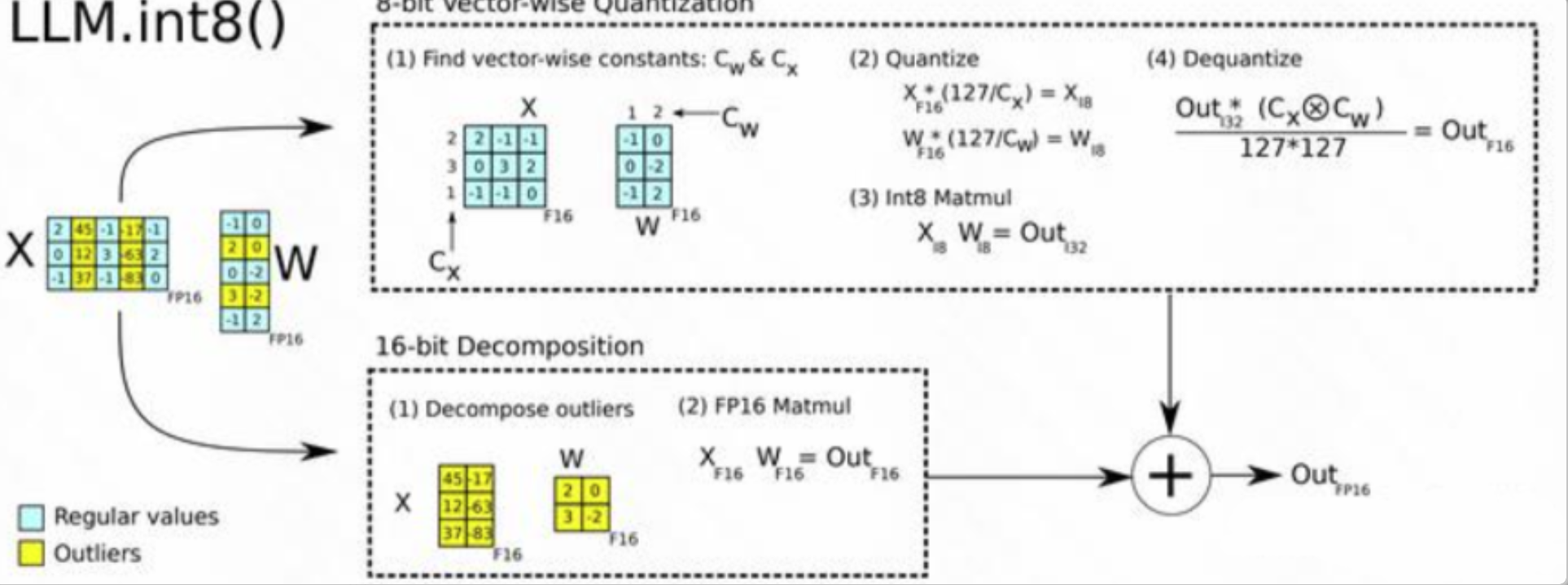由于观察到 input 的 outliers 只会固定在几个特定的 hidden-dim 的特点(这点我在 LLaMA 模型中也观察到该现象, 且随着模型加深越发严重. 具体原因个人分析为 RMSNorm 引起), 且 outliers 占据的 dims 很少(不到 1%). 故提出将 Linear 拆成两部分, 一部分为 int8, 一部分为 fp16, 分别计算后相加. 该方法得到广泛的应用, 有两个方面, 一个是因为被 huggingface 集成, 另一个是因为其几乎不掉点. 但该方法的缺点也是比较明显: 模型量化仅到 8bit, 仍是 4bit 的 2 倍大; Linear 的 latency 大幅上升, 原因在于它拆成两个 matmul kernel, 而且后续为了 fp16 相加引入外积操作等, 即计算流程更为复杂多步